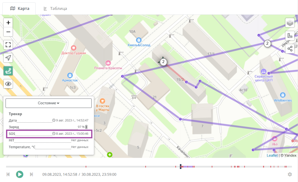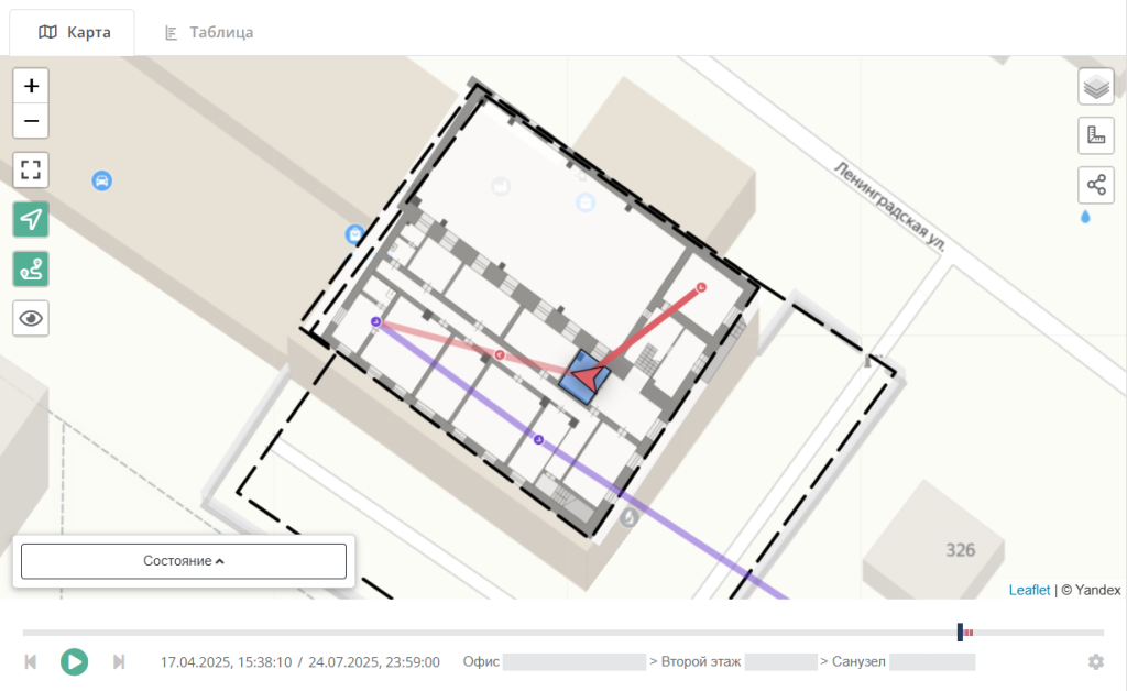 Данные с трекеров передаются через беспроводную сеть базовых станций LoRaWAN, развернутую на контролируемой территории, на платформу мониторинга Радиус охвата одной БС достигает до 5 км. | Платформа AirBit позволяет: • Отображать историю передвижения (маршруты); • Генерировать уведомления и алерты (SMS, Telegram, email); • Настраивать геозоны и контролировать выход за пределы; • Отправлять команду на вызов объекта (зуммер) |