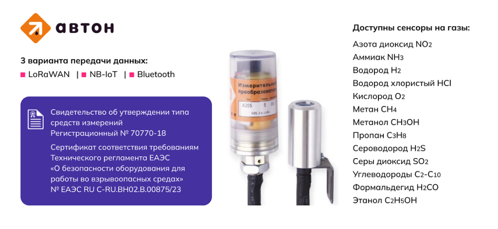 | Беспроводные автономные газоанализаторы регистрируют концентрацию газа в воздухе | → | Полученные данные передаются на базовую станцию посредством LoRaWAN или NB-IoT | → | Далее — на аналитическую IoT-платформу для дальнейшего мониторинга |