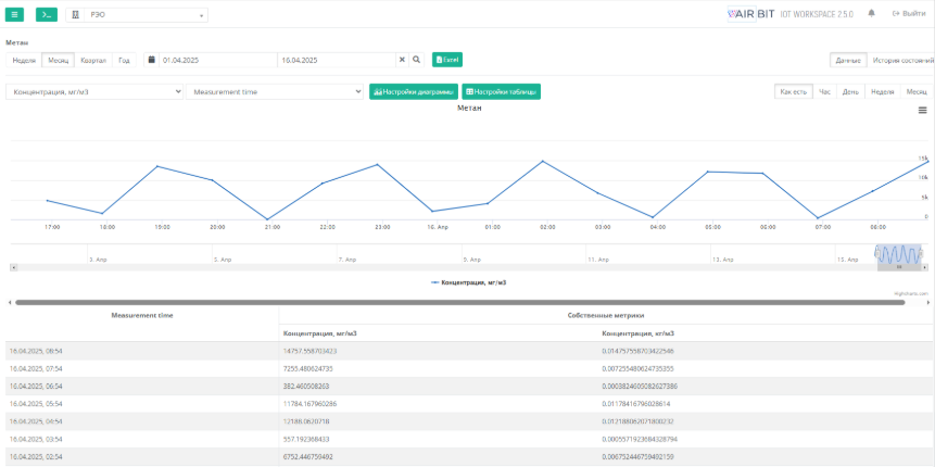 Графические тренды и табличные значения по контролируемому показателю: • концентрация газа, • заряд батарея и др. |