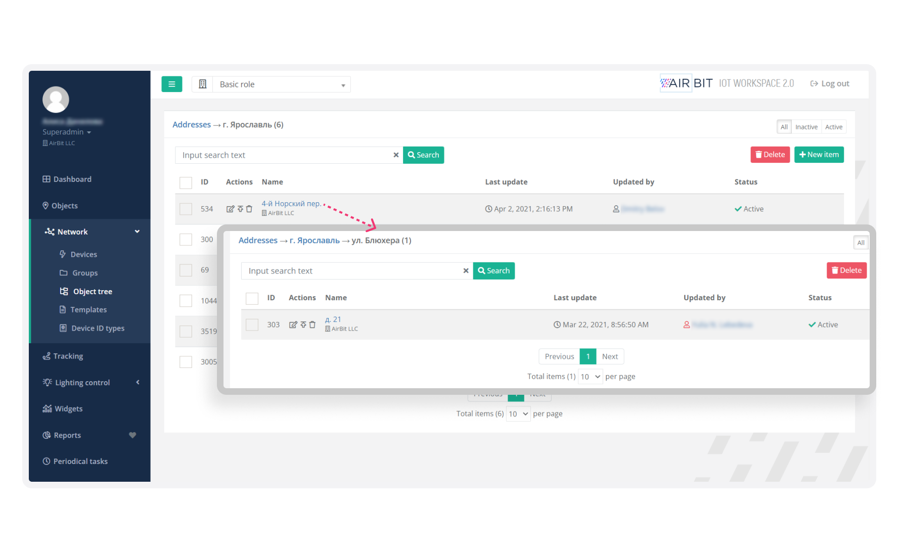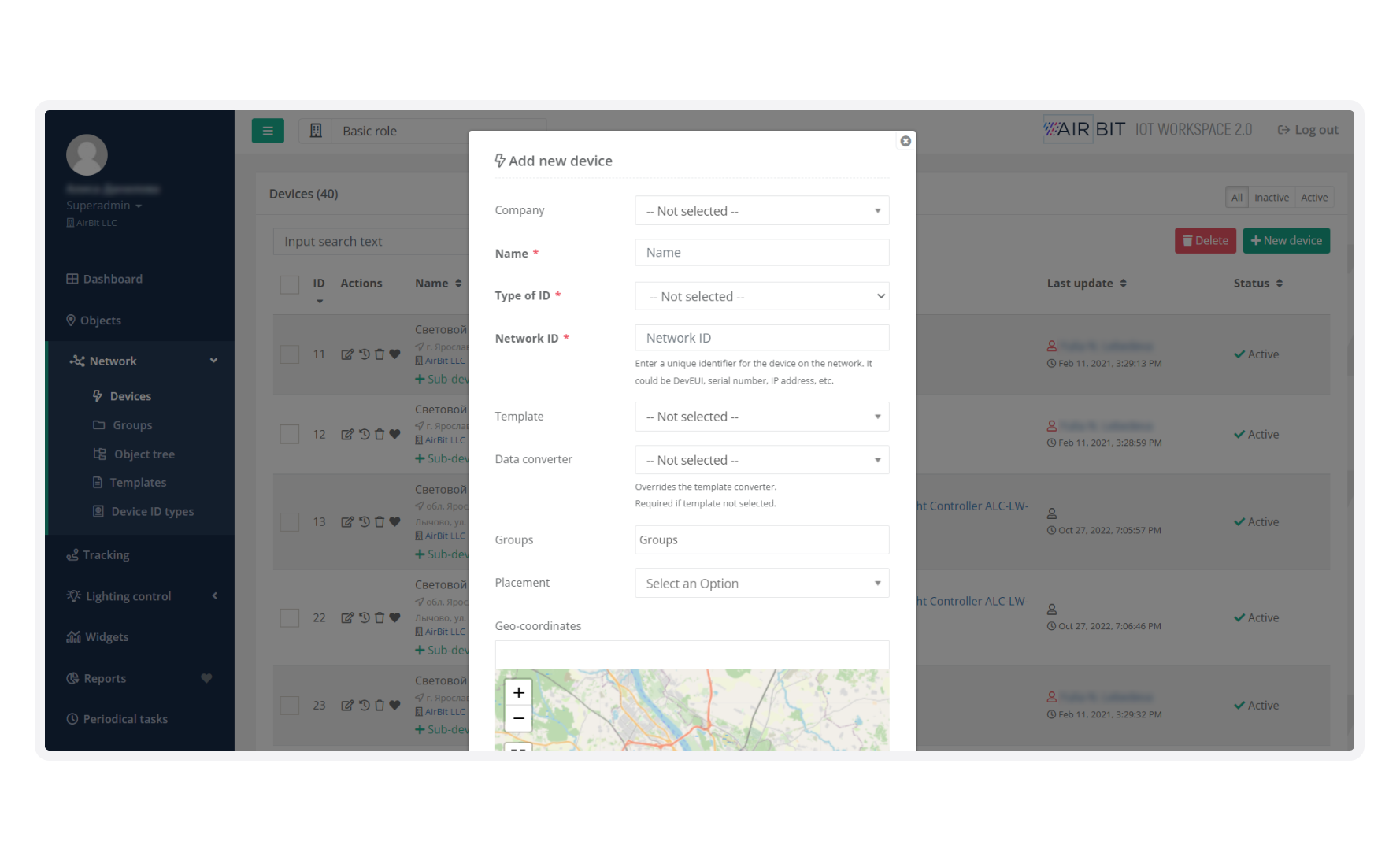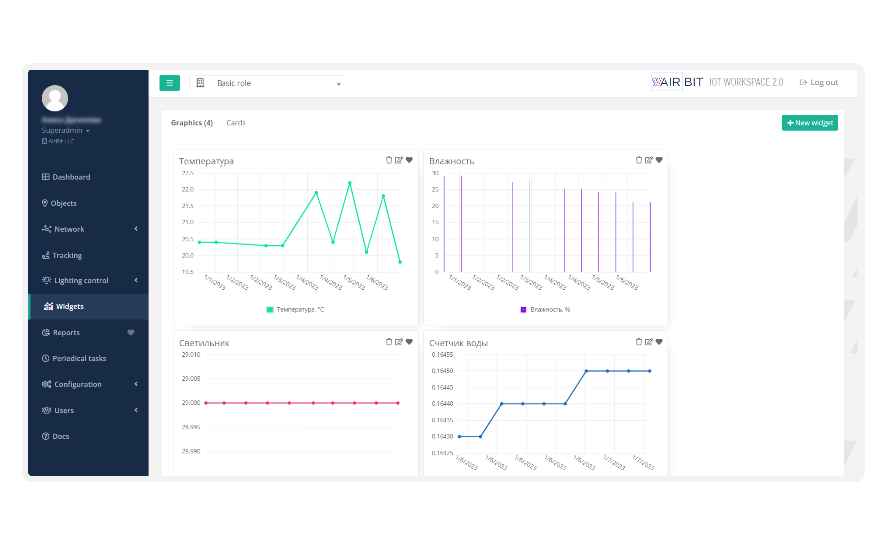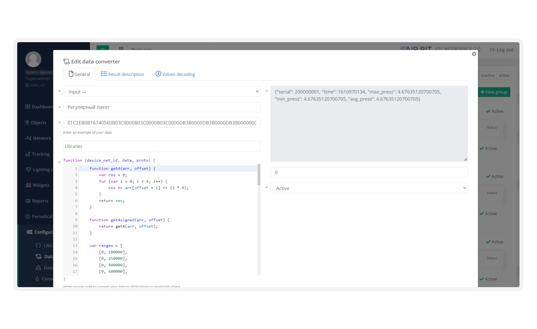 В одном "пространстве" собираются данные из различных внутренних и внешних источников и сетей: AirBit LoRaWAN Network Server, NB-IoT, SigFox. Настроены интеграции с сетевыми серверами ChirpStack, Эр-Телеком, TTN.