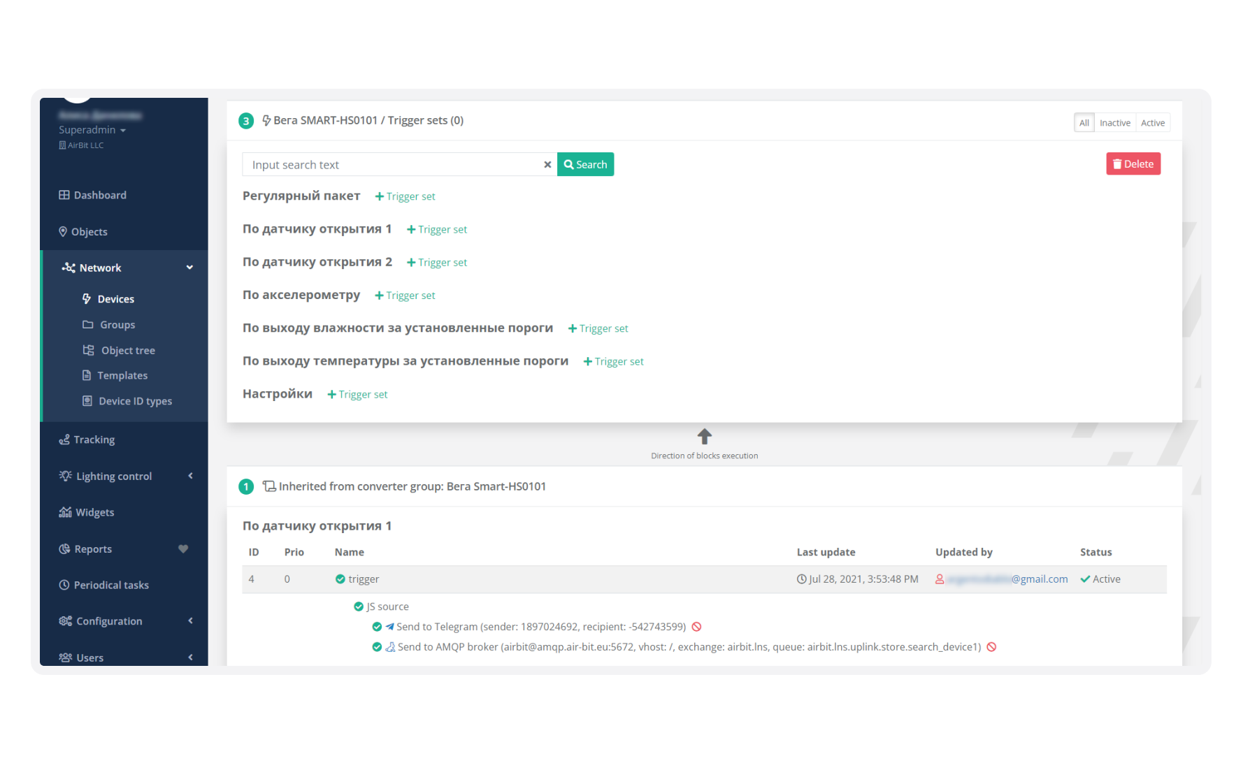 Создание различных логических сценариев для управления данными: отправка тревожного сообщения по наступлению события, отправка данных во внешние системы и т.д. Триггер можно задать на устройство, шаблон устройства, конвертер данных. Перечень доступных каналов для отправки сообщений: электронная почта, СМС, Телеграм, AMQP, HTTP, MQTT.