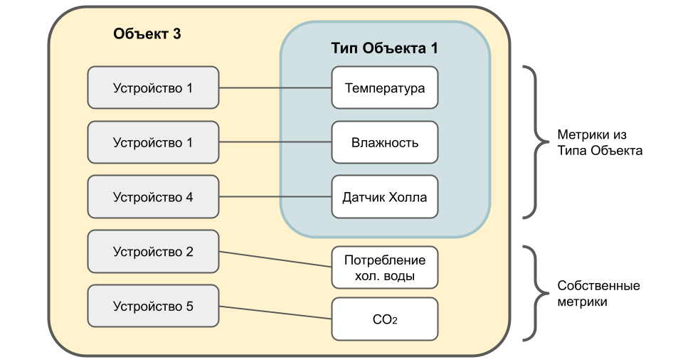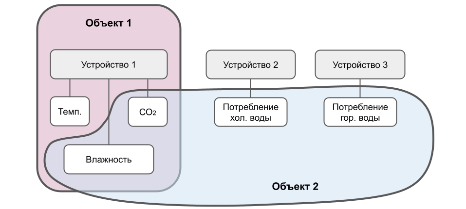 Например, Объектом можно назначить один цех, в котором расположены несколько устройств: датчики температуры, влажности, приборы, которые передают потребление воды, газа и т.д. Этот Объект можно рассматривать в целом, а не только как набор отдельных независимых приборов.