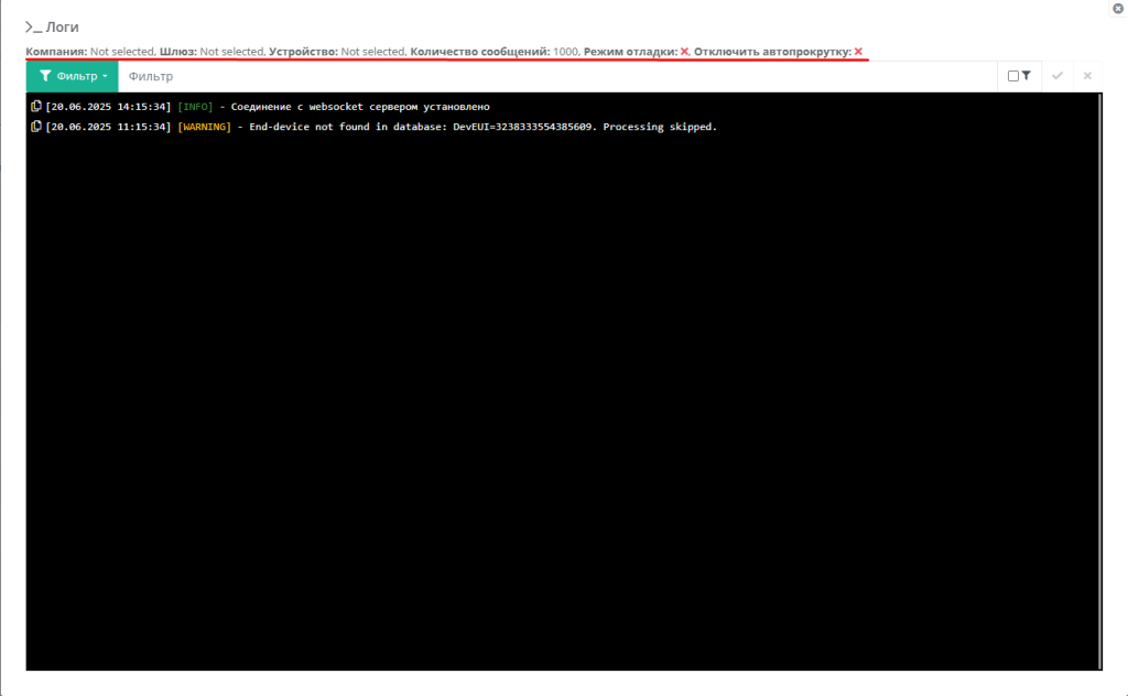 Открыть логи – по нажатию на иконку “>_” в разделах Управление / Устройства и Конфигурация / Каналы данных.