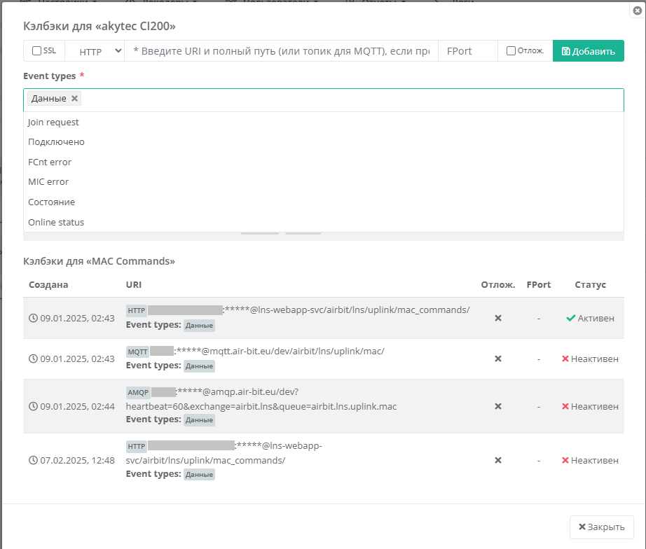В форме создания / редактирования каналов данных в поле “Класс конвертера” добавлены два конвертера: Er-Telecom [HTTP] и Chirpstack [HTTP].